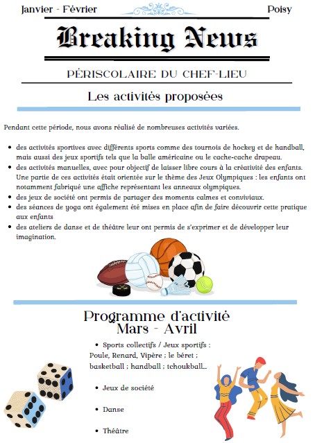 Un large éventail d’activités artistiques, culturelles et sportives est également proposé aux enfants des groupes scolaires de Brassilly, du Parc et du chef-lieu durant la pause méridienne.