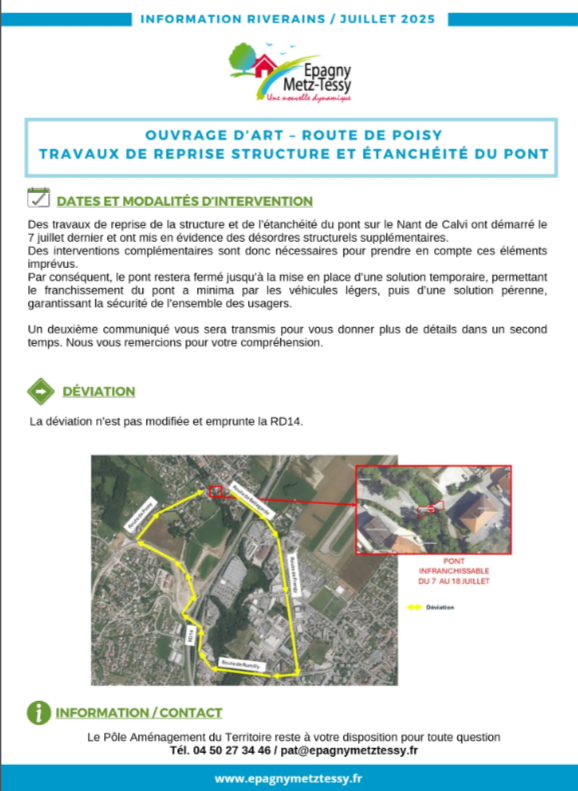 Des travaux de reprise de la structure et de l’étanchéité du pont sur le Nant de Calvi ont démarré le 7 juillet dernier et ont mis en évidence des désordres structurels supplémentaires.