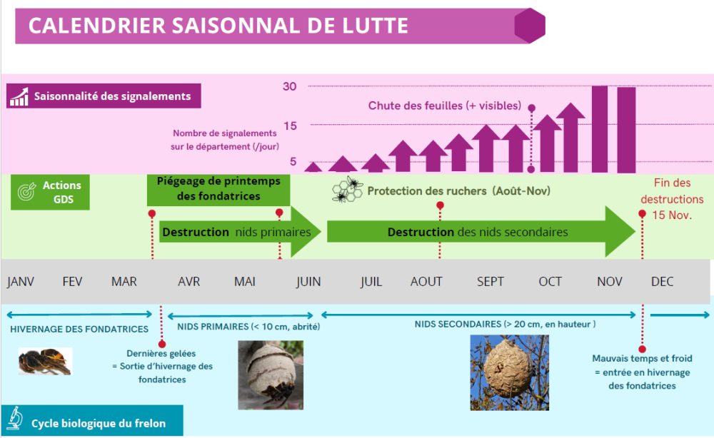 Un dispositif de surveillance et de lutte, piloté par la FRGDS, vise à repérer et faire détruire les nids par des entreprises spécialisées avant la sortie des fondatrices (à la fin de l’automne), afin de maintenir la population de frelons asiatiques à un niveau acceptable.