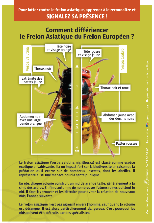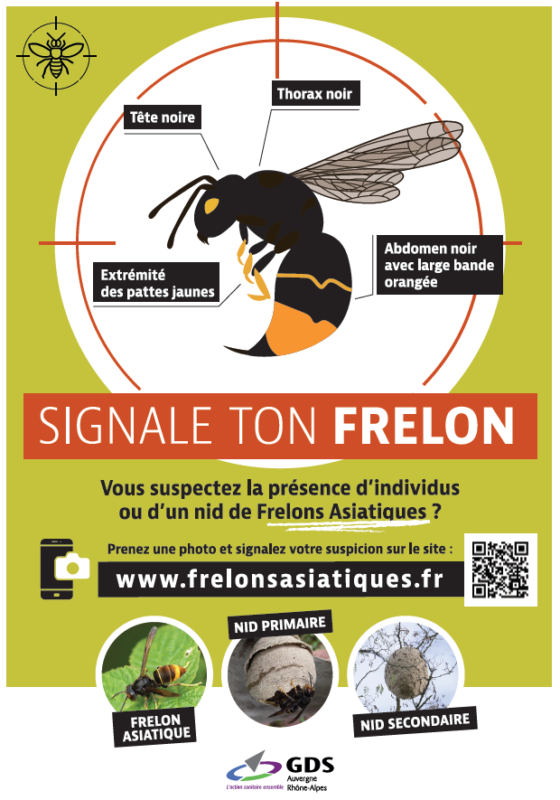 Toute personne suspectant la présence d’un frelon asiatique est invitée à en faire le signalement soit :